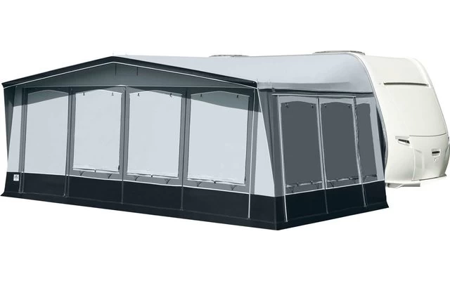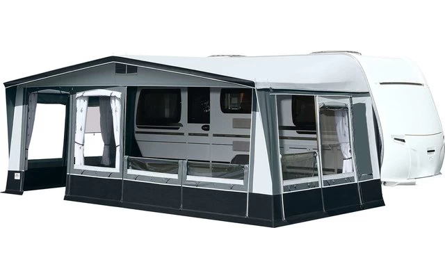 Das Brand Palazzo, bei diesem Saison- und Ganzjahres-Vorzeltmodell kommt für das Dach und die Seitenwände ein robustes Polychlorid-Material zum Einsatz. Die Vorderwand wird aus atmungsaktivem „Ten Cate“-Gewebe gefertigt. Frei wählbare Eingangsposition durch die Elementtechnik der Vorderwand. Für die Seitenwände gibt es insgesamt vier Fensterelemente: zwei Folienfenster und zwei Lüftungsfenster. Diese vier Elemente können nach Wunsch positioniert werden. Fensterklappen, Wetterschutzabdeckung der Reißverschlüsse, eine verschließbare Hochentlüftung und ein 28 mm Stahlrohrgestänge mit PowerGrip und Vordachverstärkung komplettieren die umfangreiche Serienausstattung.