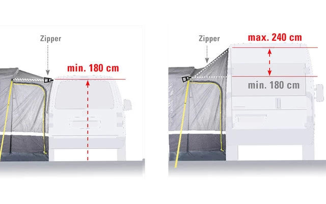 Das praktische „Drive Away Zip System“ ermöglicht ein leichtes Fahrzeug An- und Abdocken. Das Zelt ist mit einer Keder-Reißverschlussleiste ausgerüstet. Keder in die Kederschiene am Fahrzeug einziehen und mittels Reißverschluss verbinden. Die Schleuse ist komplett aufrollbar.