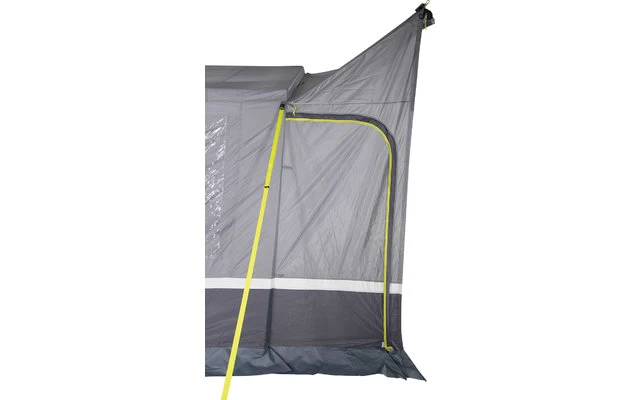 4 neongelbe, verstellbare Sturmbänder und Abspannleinen sind in der Dämmerung gut sichtbar. Die Schleuse hat eine Dach-Befestigungslänge von 245 cm und eine verstellbare Anbauhöhe von 180-240 cm mittels Reißverschlusses und verstellbarem Gurtband. 2 Schleusentüren ermöglichen den Zugang zum Fahrzeug. Das praktische „Drive Away Zip System“ ermöglicht ein leichtes Fahrzeug An- und Abdocken. Das Zelt ist mit einer Keder-Reißverschlussleiste ausgerüstet. Keder in die Kederschiene am Fahrzeug einziehen und mittels Reißverschluss verbinden. Die Schleuse ist komplett aufrollbar. Flexible Befestigung am Fahrzeug. 1- Hohlsaum Schleusenstab mit Klemmen oder Abspannleinen.