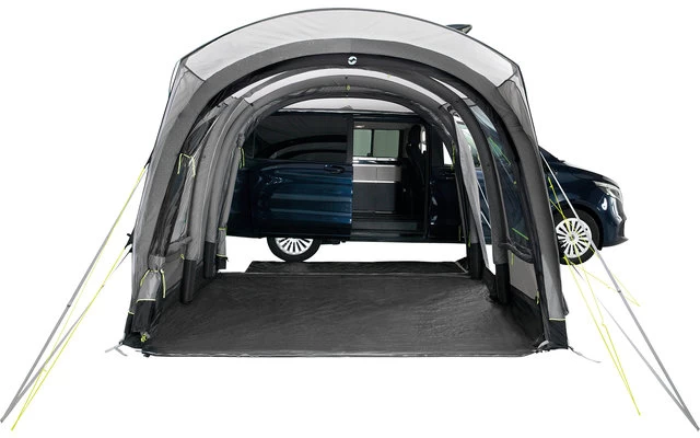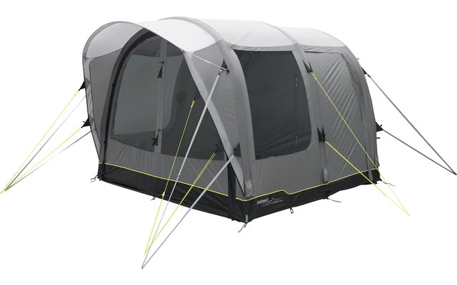 Das freistehende Busvorzelt Newburg 240 Air wird mit drei Luftschläuche aufgeblasen und bietet einen Innenraum von 240 x 300cm an. Die wegrollbare Vordertür unter dem abgerundeten Vordach ist mit einem Insektennetz ausgestattet. Auch der Seiteneingang auf der rechte Seite hat eine zusätzliche Insektenschutz-Tür. Das optionale Innenzelt bietet zwei Schlafplätze. In der Vorzeltschleuse befinden sich Eingänge auf beiden Seiten und für den Boden ist eine Bodenplane im Lieferumfang. Das Vorzelt lässt sich mithilfe eines Doppel-Keders (5 und 7 mm) oder mit Spannleinen anbauen. Sturmbänder sorgen zusammen mit den robusten Luftschlauchsystem für eine ausgezeichnete Stabilität.